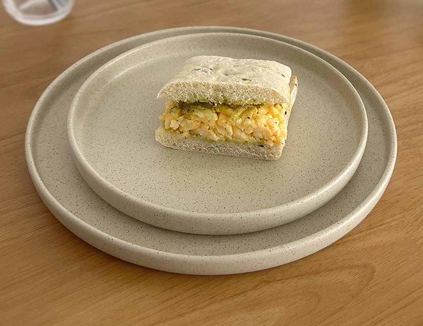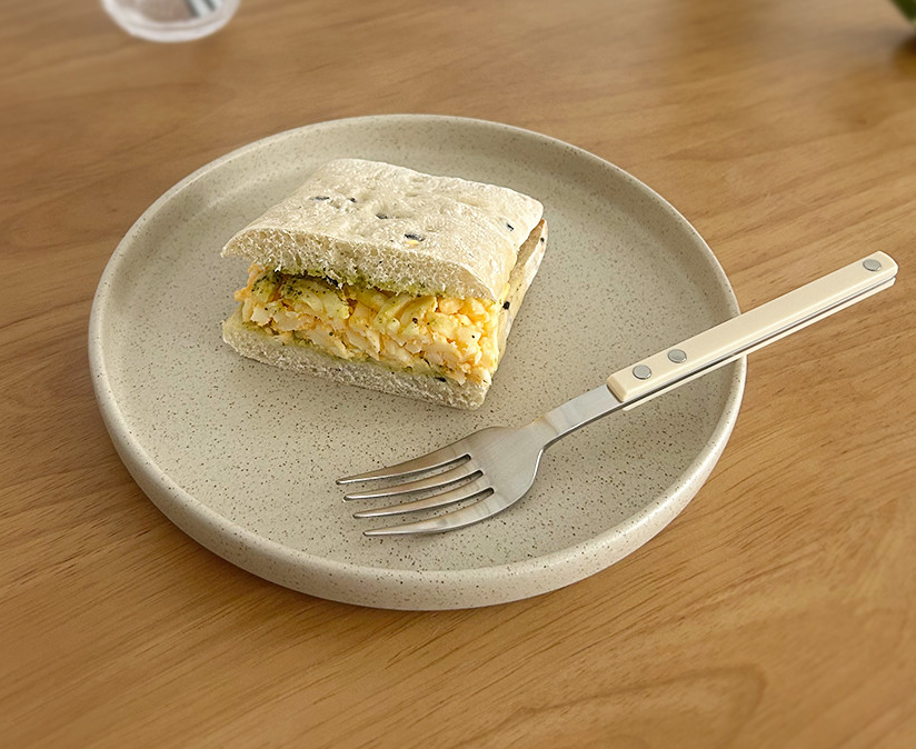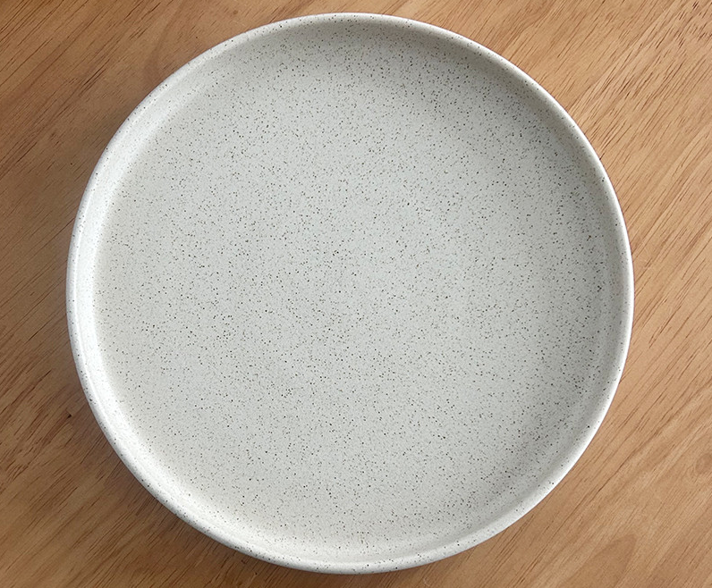 This matte round brunch platter features a calm beige dot pattern that beautifully highlights a variety of foods. Its flat design makes it perfect for a clean and elegant table setting.