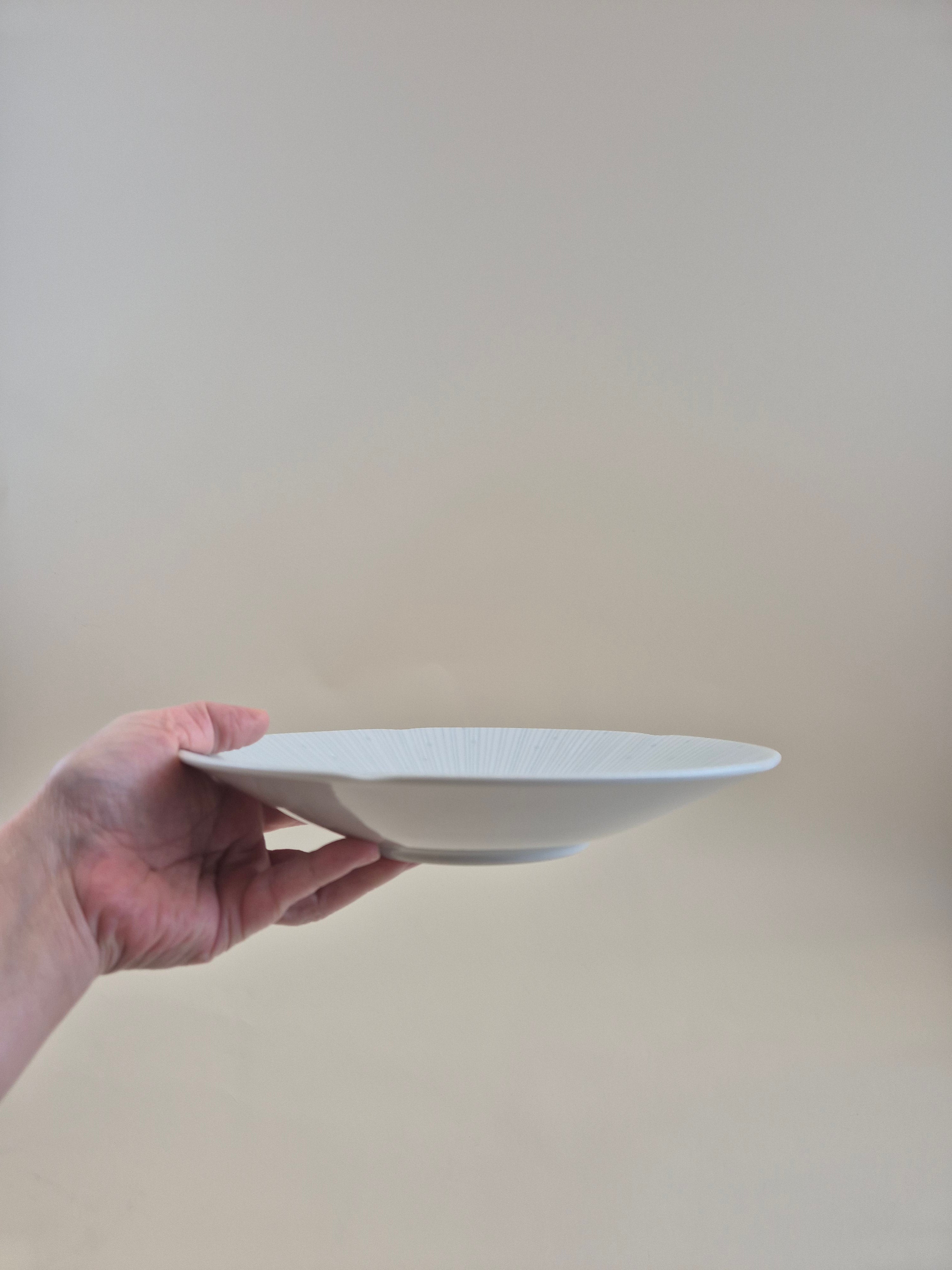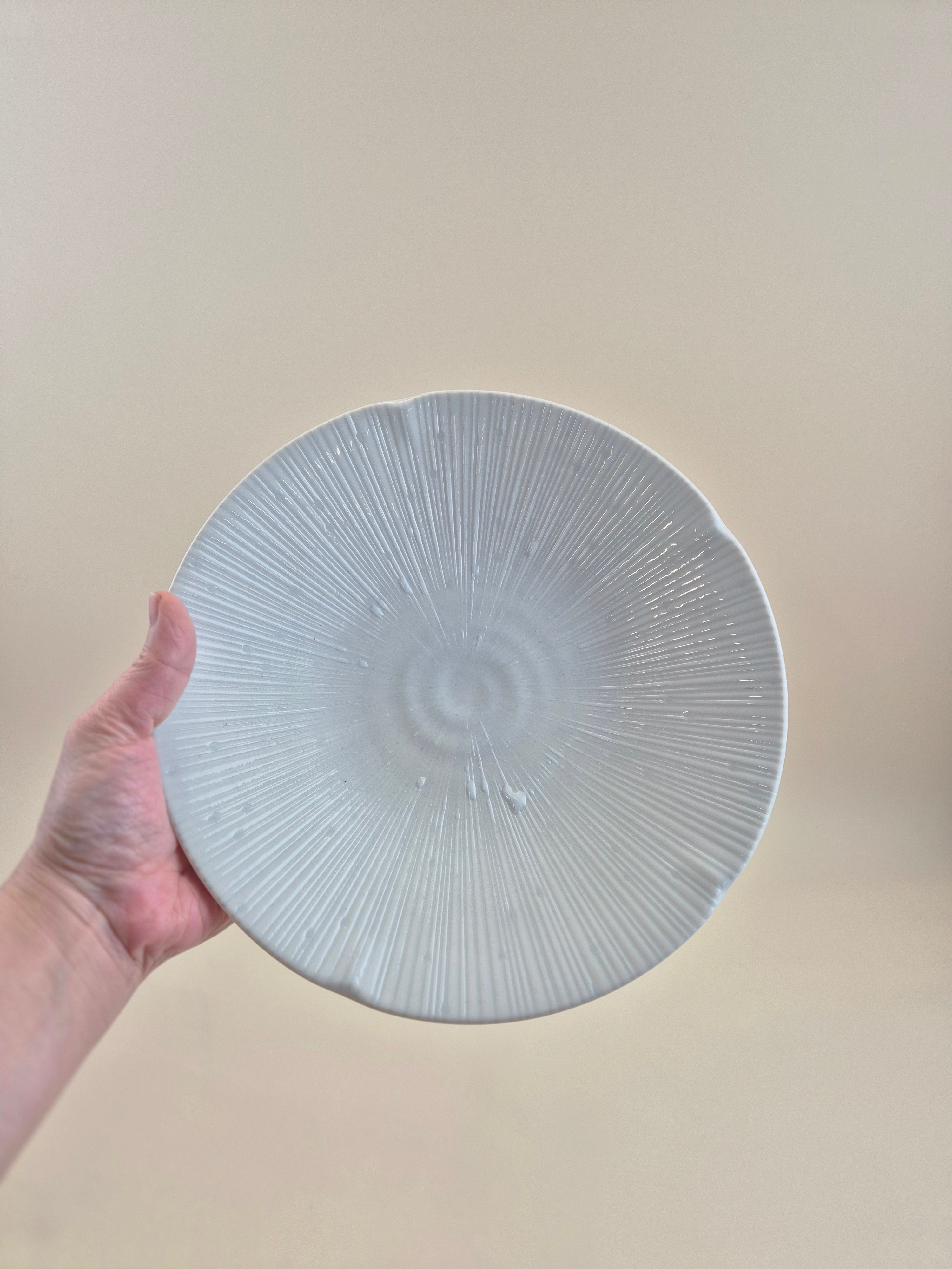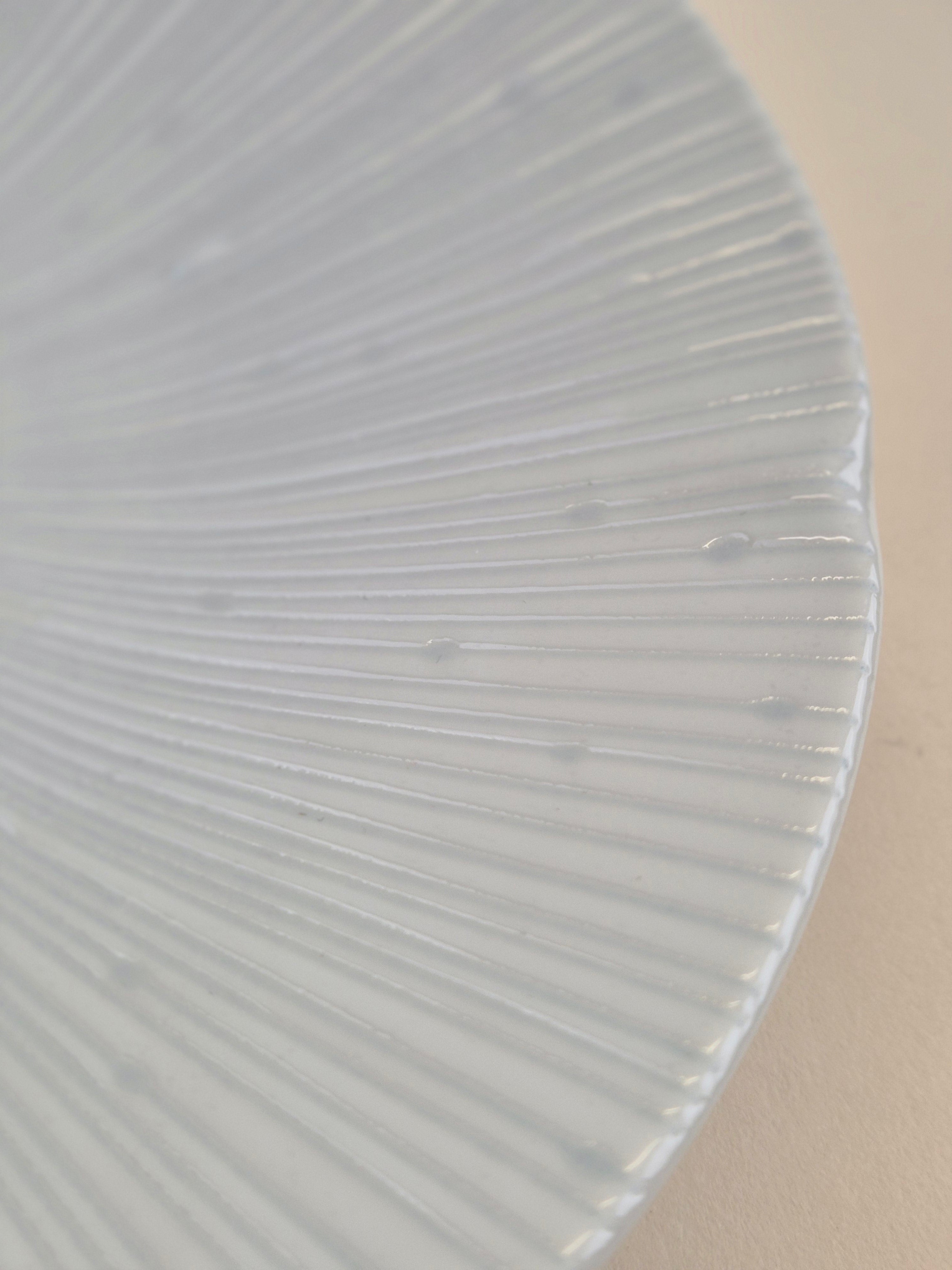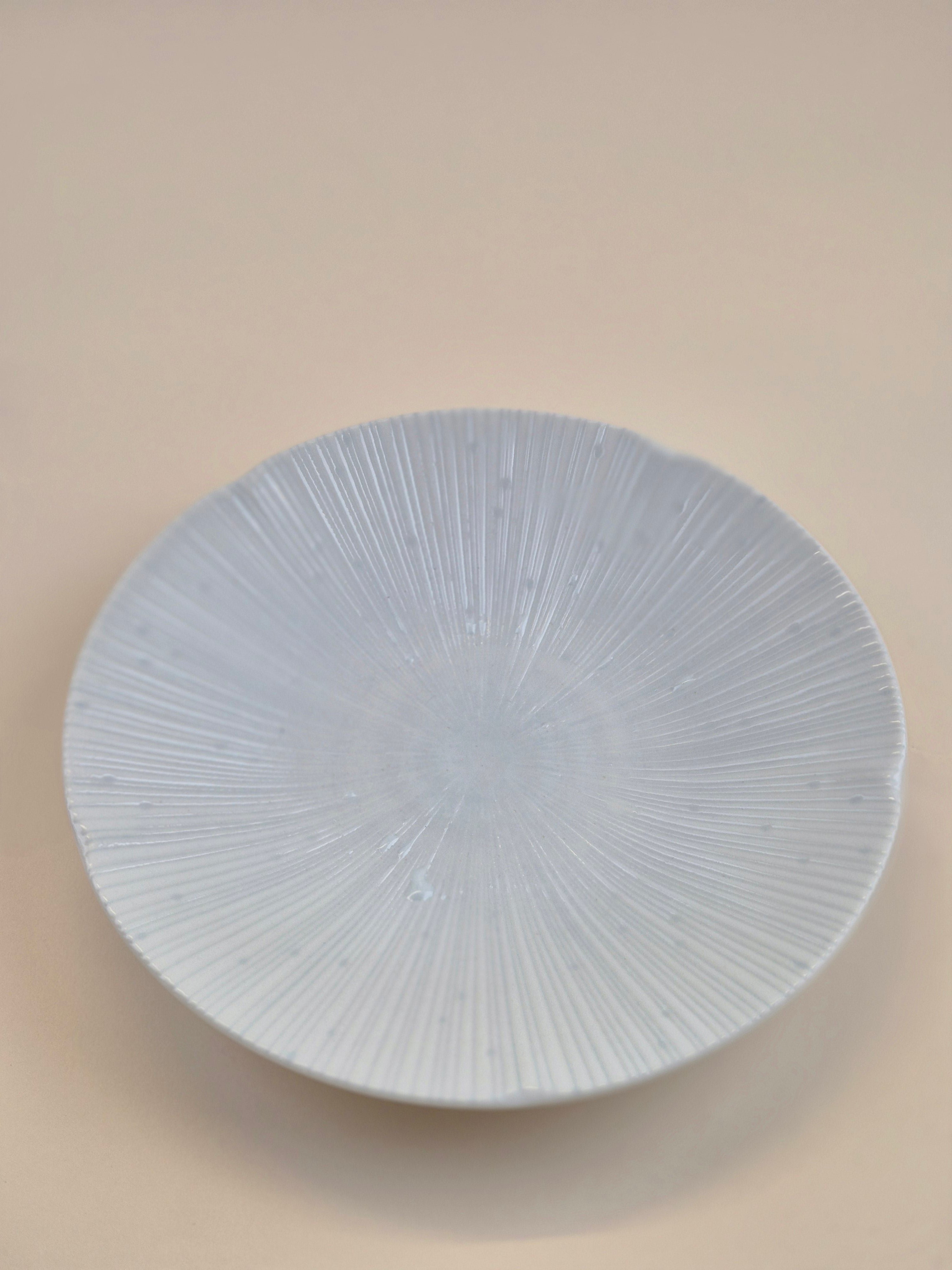 The Kyosendan Pasta Bowl features a white base with a beautifully unique dual-texture design. The outer surface has a smooth glossy finish, while the inner surface showcases striking, radiating brush-like lines paired with delicate droplet patterns. Its subtle pearlescent sheen and water-inspired detailing create a refreshing, eye-catching presentation for any table setting. Perfect for pasta, salads, rice dishes, or daily meals.